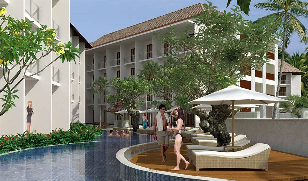 Architecturally, the design adopts a modern tropical resort language, integrating shaded façades, open corridors, landscaped courtyards, and indoor–outdoor public spaces suited to Bali’s climate. Material upgrades and façade articulation aim to refresh the resort’s identity while ensuring durability and ease of maintenance in a high-use coastal environment.
