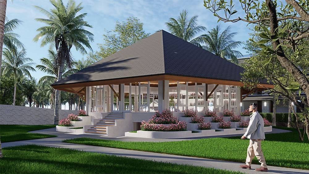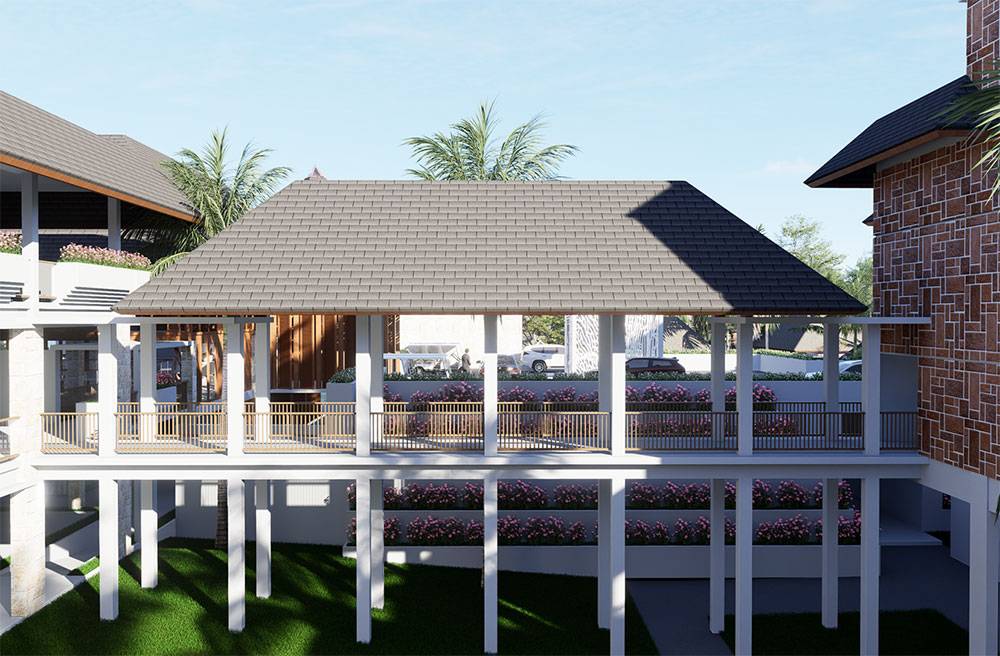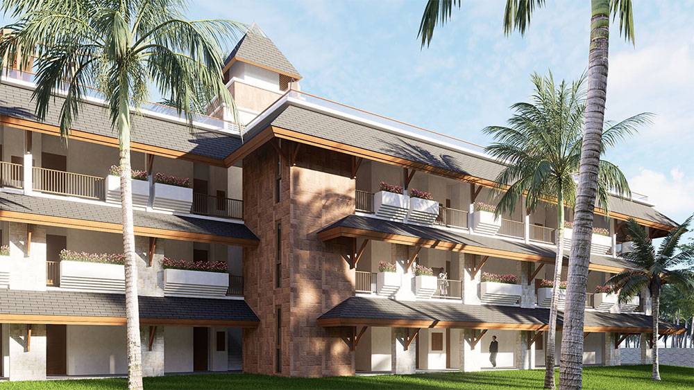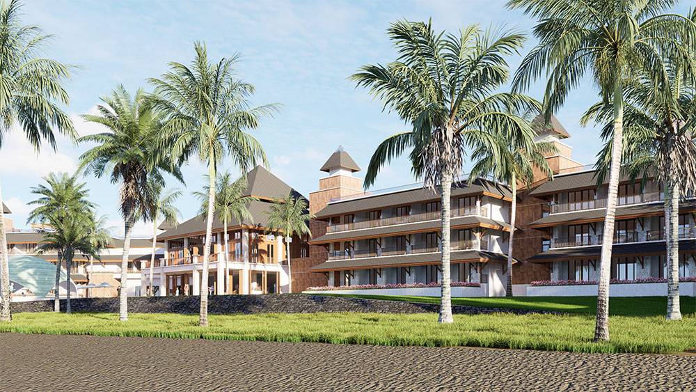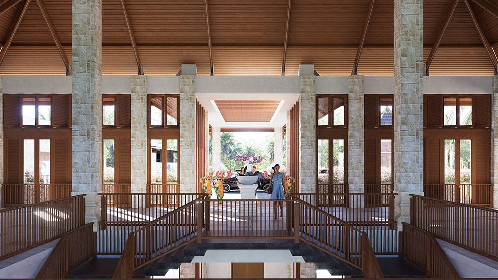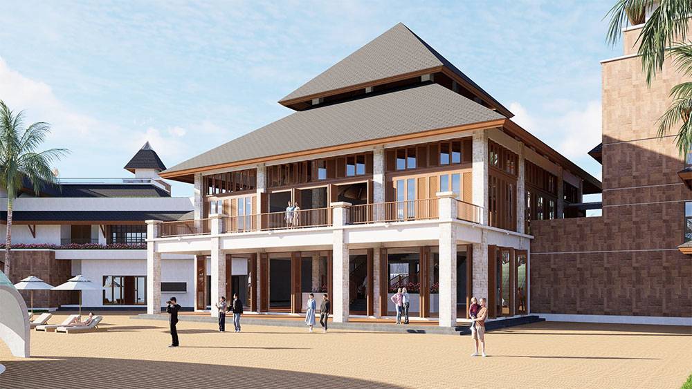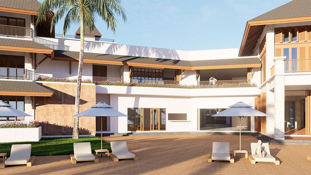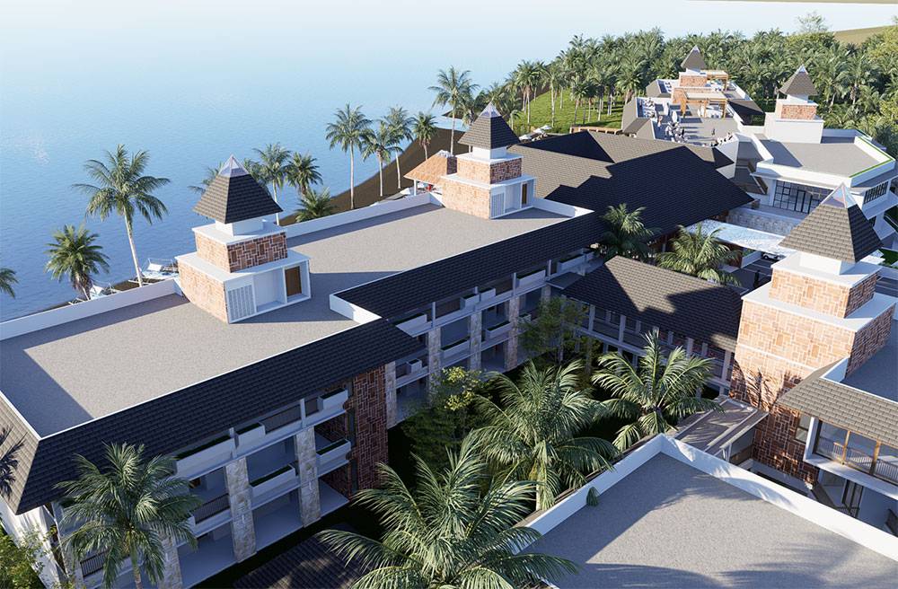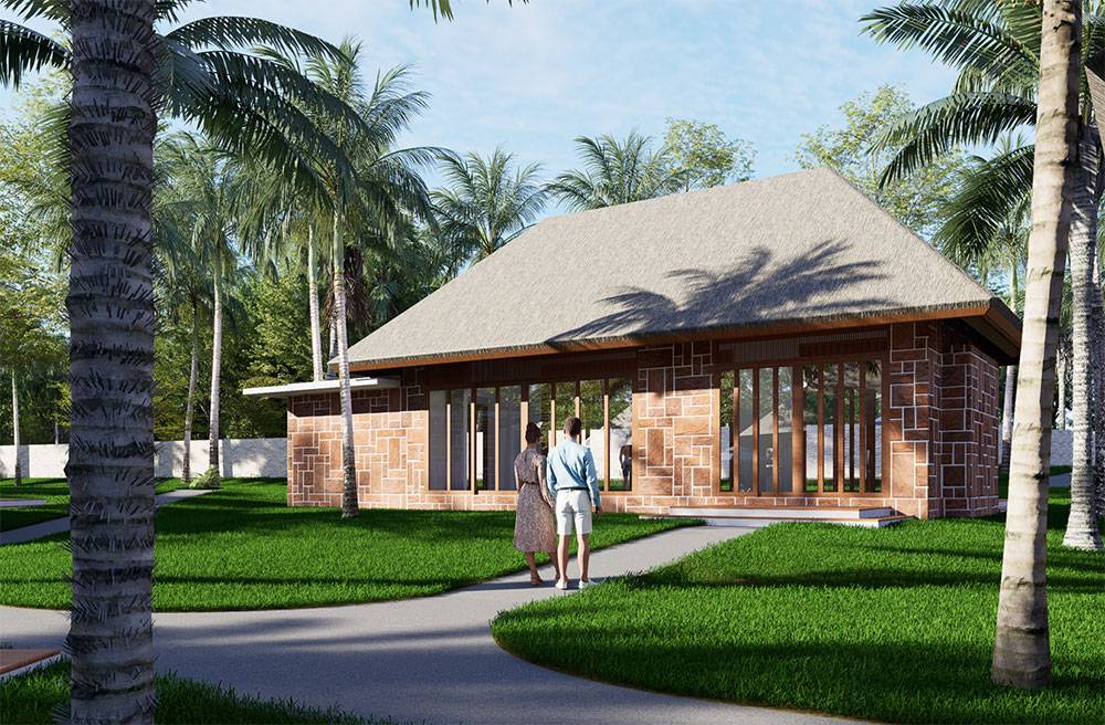 Architecturally, Naau Resort adopts a contemporary tropical language enriched by local material character. Pitched roofs, stone masonry, warm timber accents, and shaded verandas reference vernacular proportions while being interpreted through modern detailing. Building massing is carefully scaled and articulated to avoid visual dominance, ensuring the resort blends naturally with the palm-lined coastline.