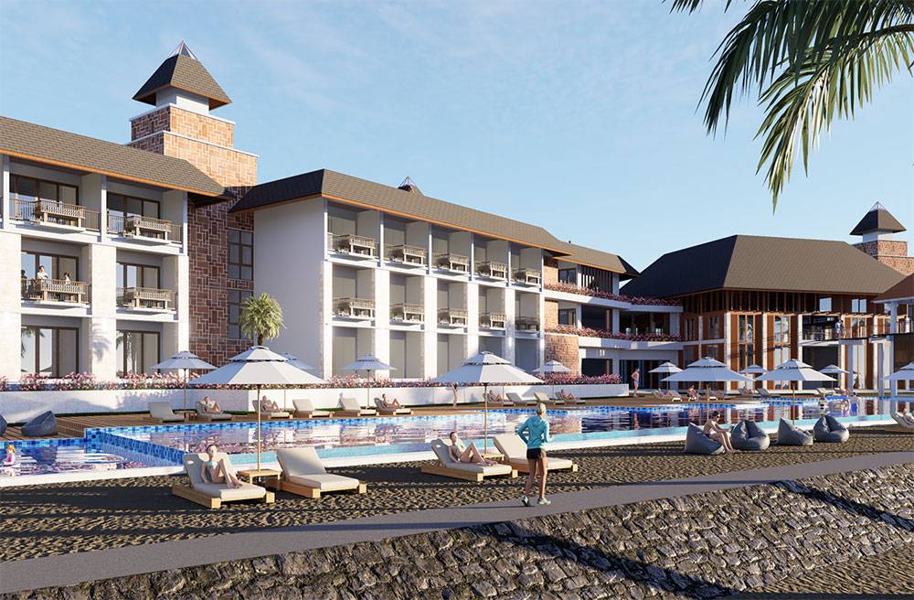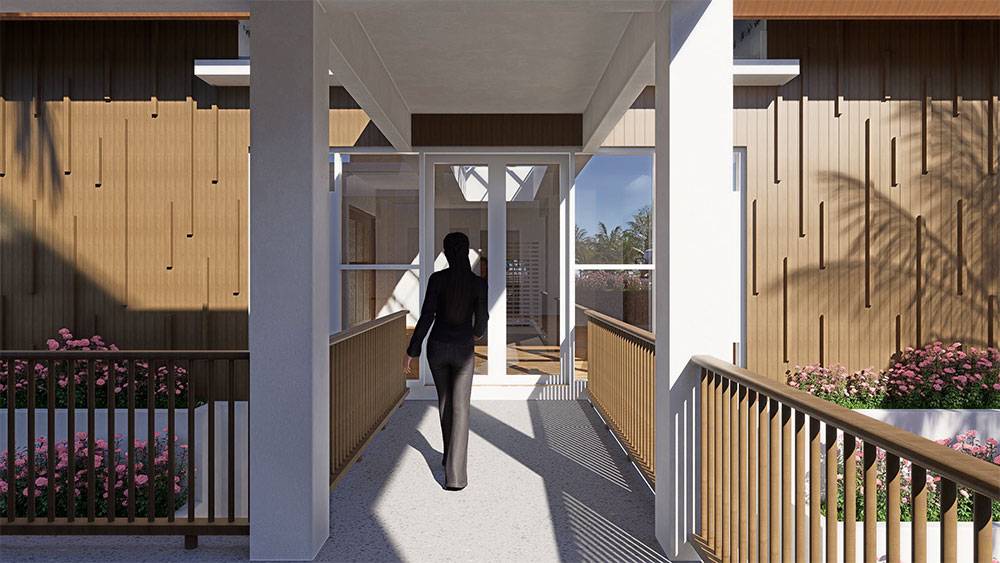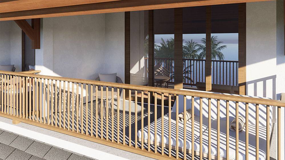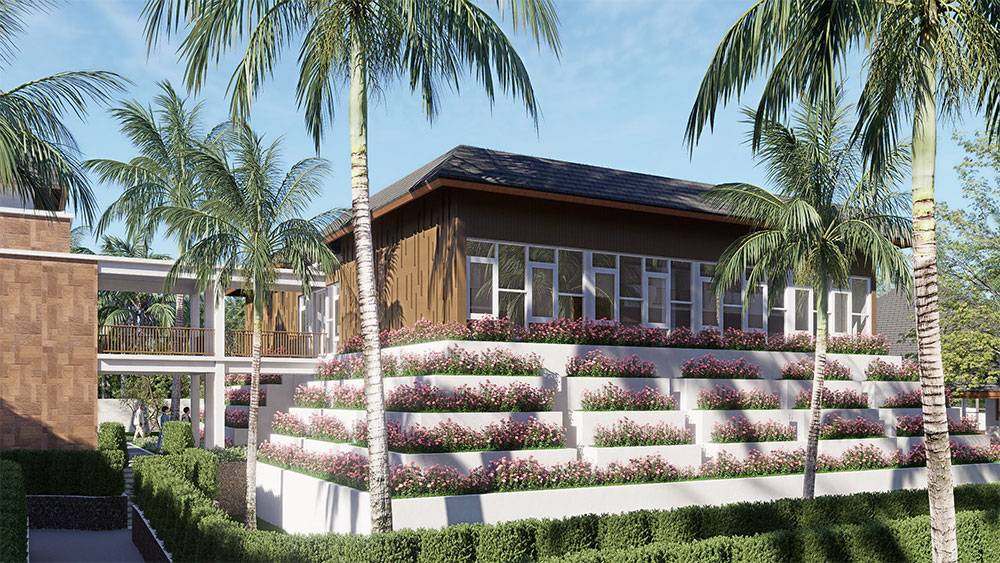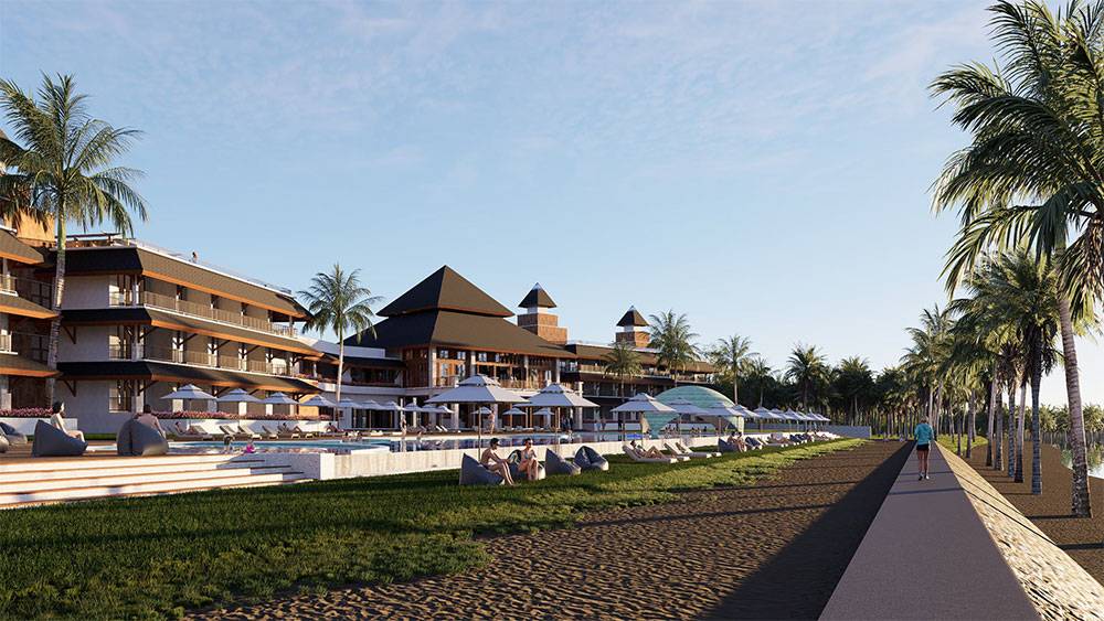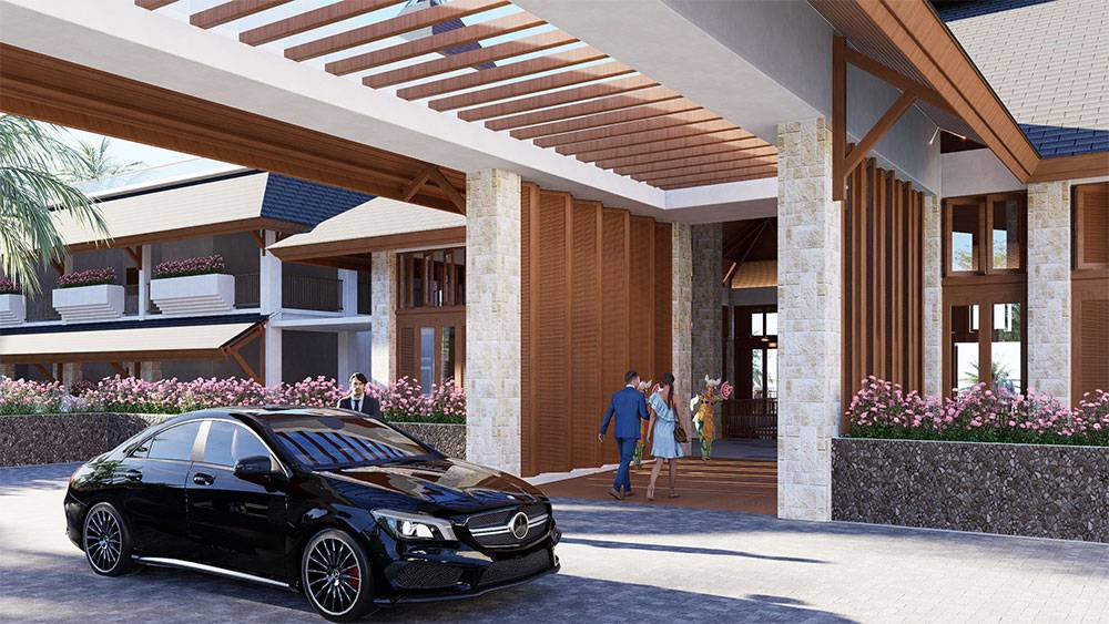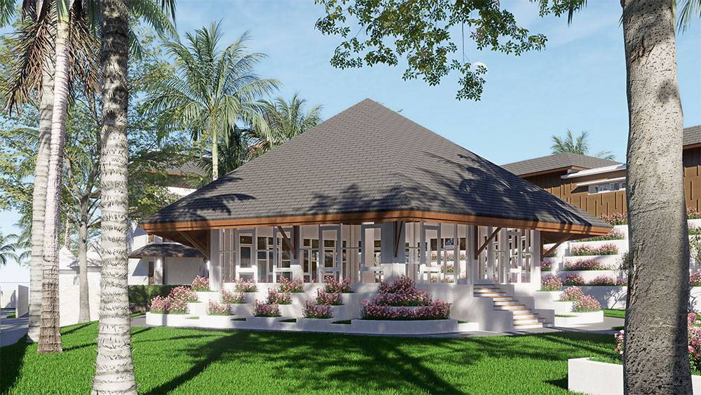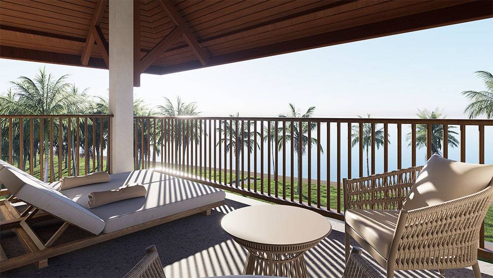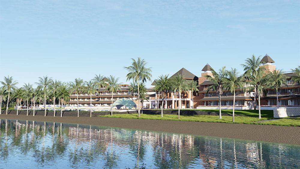 Architecturally, Naau Resort adopts a contemporary tropical language enriched by local material character. Pitched roofs, stone masonry, warm timber accents, and shaded verandas reference vernacular proportions while being interpreted through modern detailing. Building massing is carefully scaled and articulated to avoid visual dominance, ensuring the resort blends naturally with the palm-lined coastline.