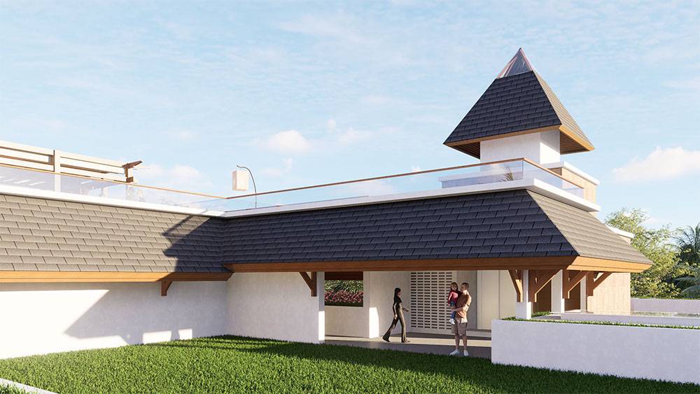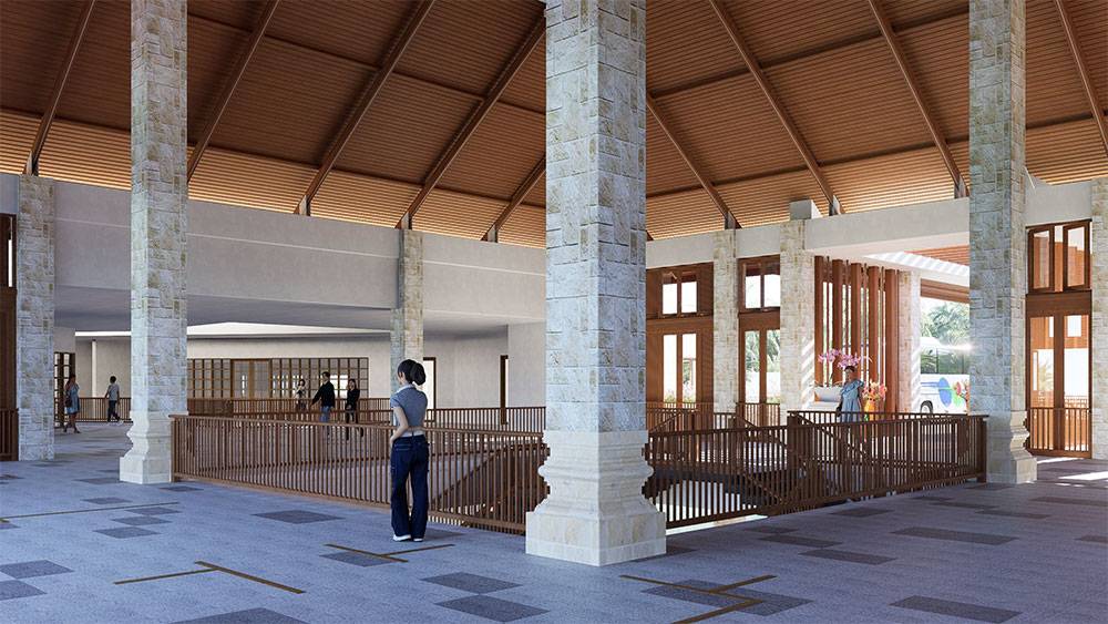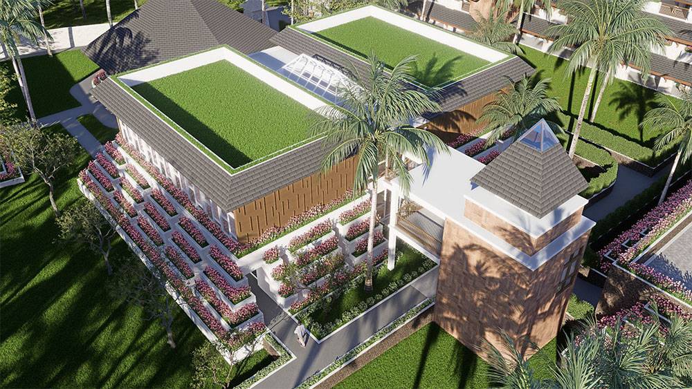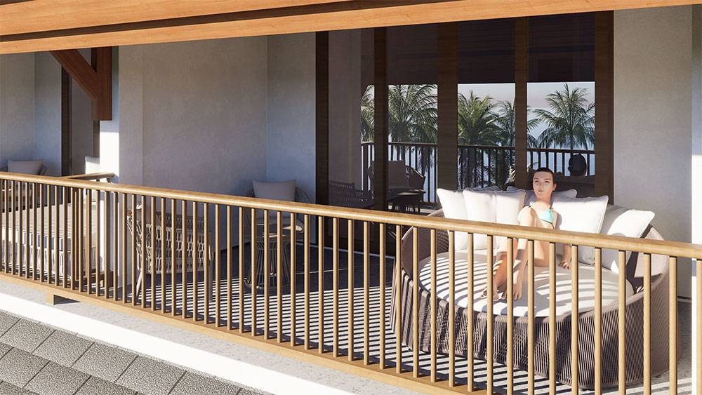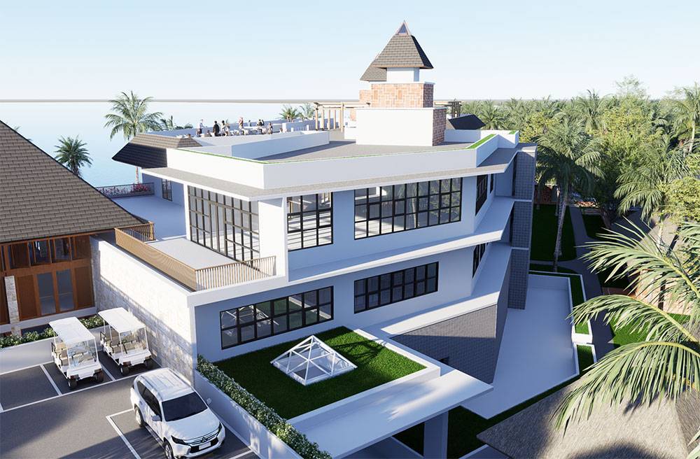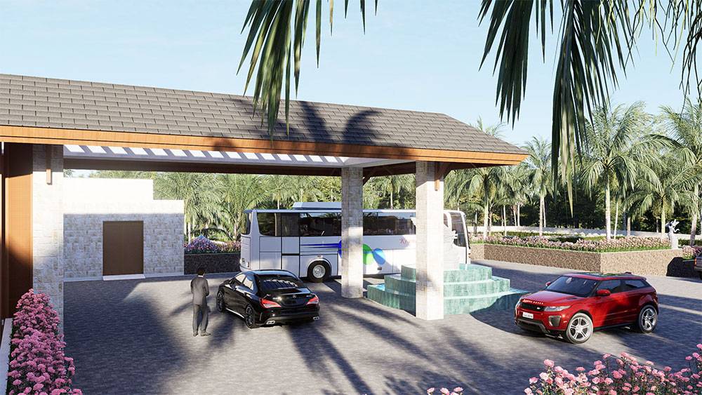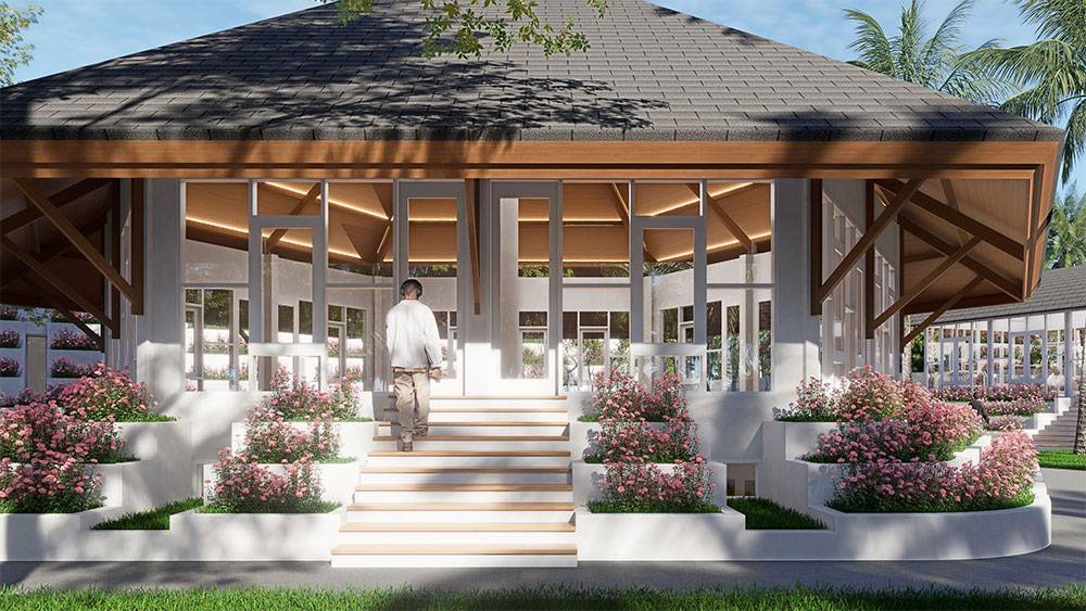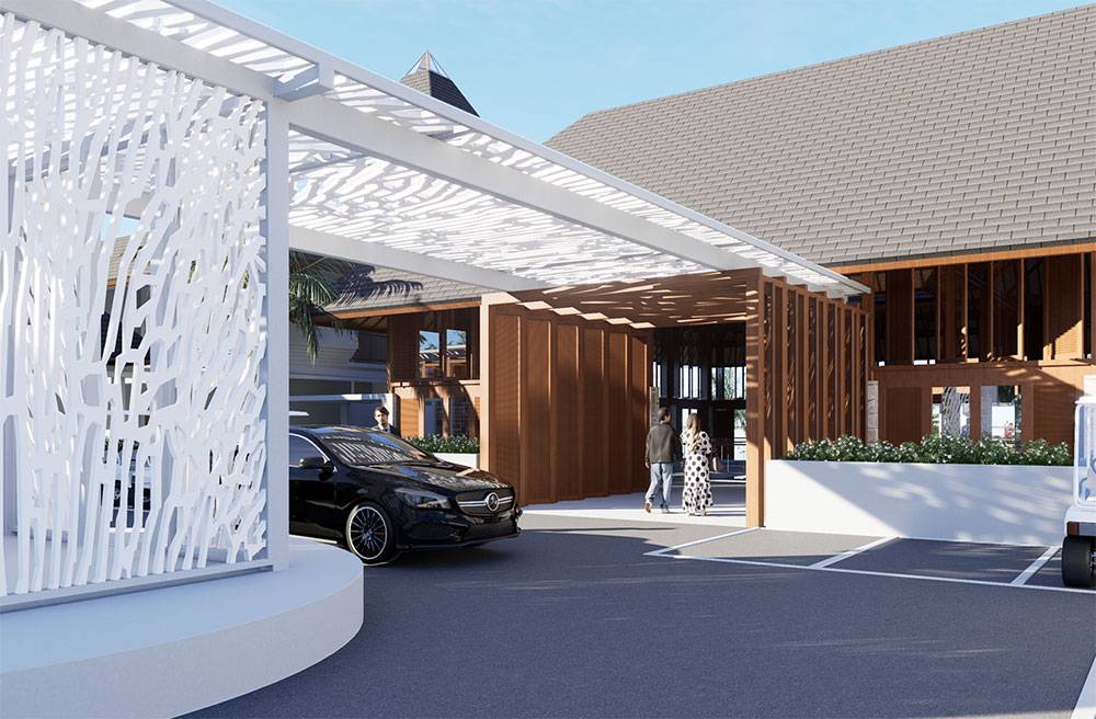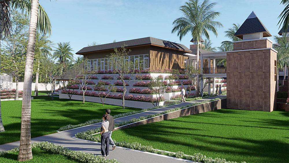 Architecturally, Naau Resort adopts a contemporary tropical language enriched by local material character. Pitched roofs, stone masonry, warm timber accents, and shaded verandas reference vernacular proportions while being interpreted through modern detailing. Building massing is carefully scaled and articulated to avoid visual dominance, ensuring the resort blends naturally with the palm-lined coastline.