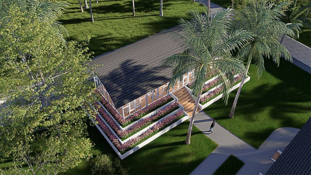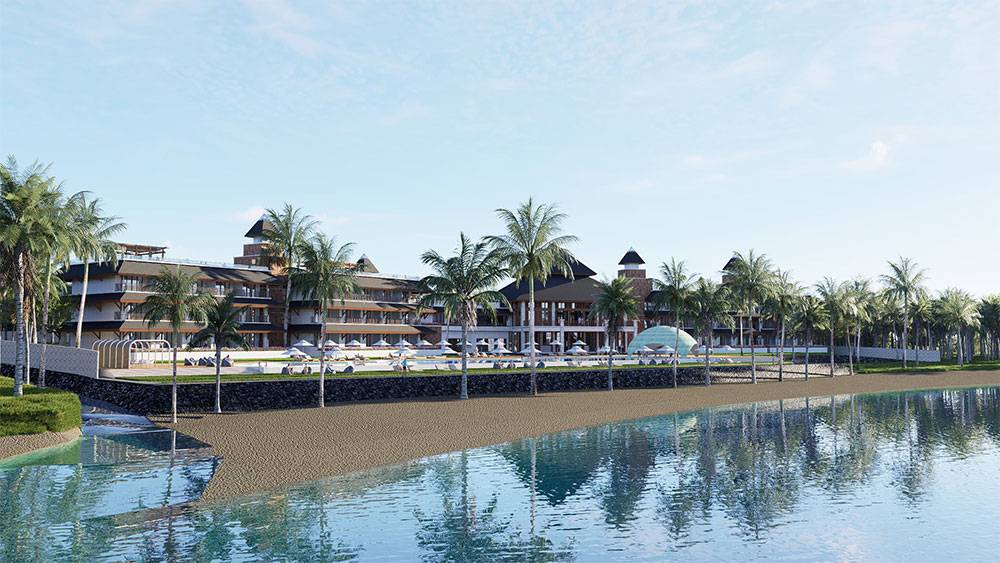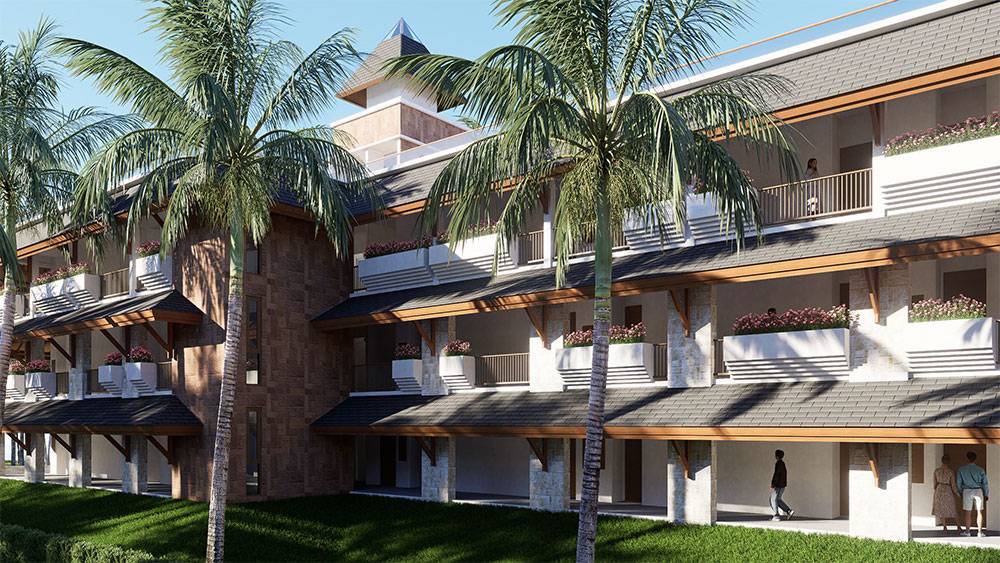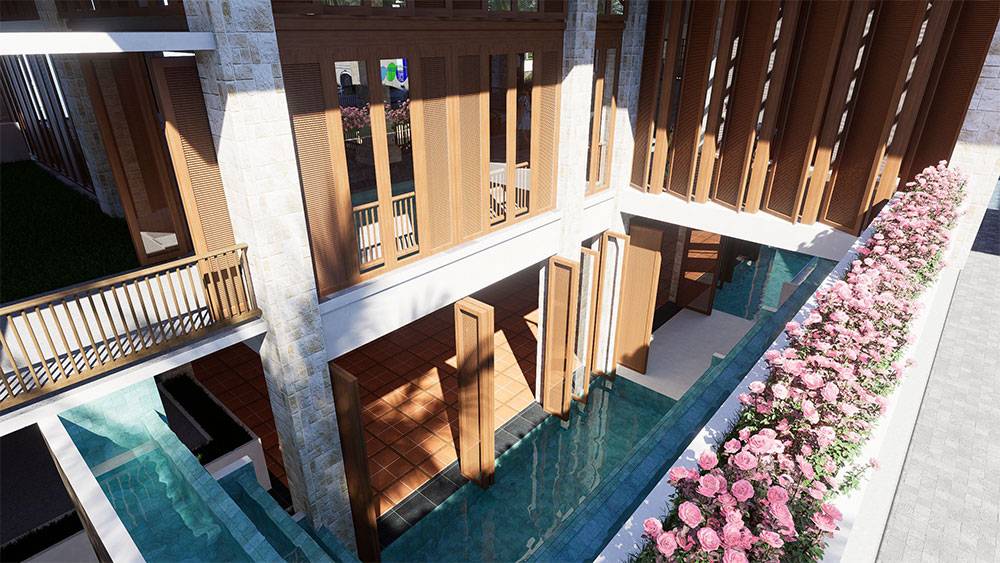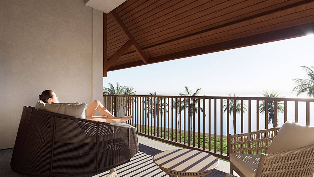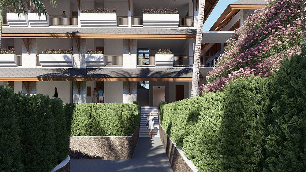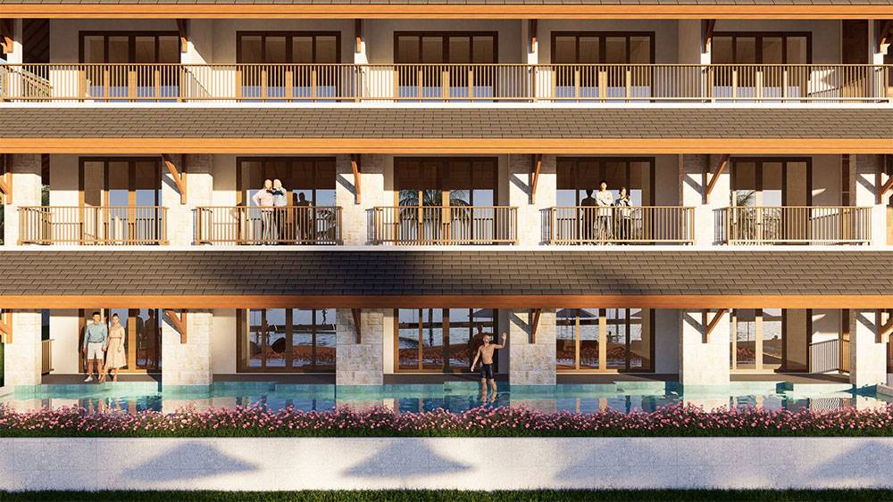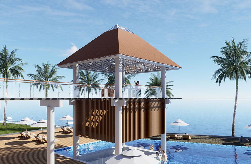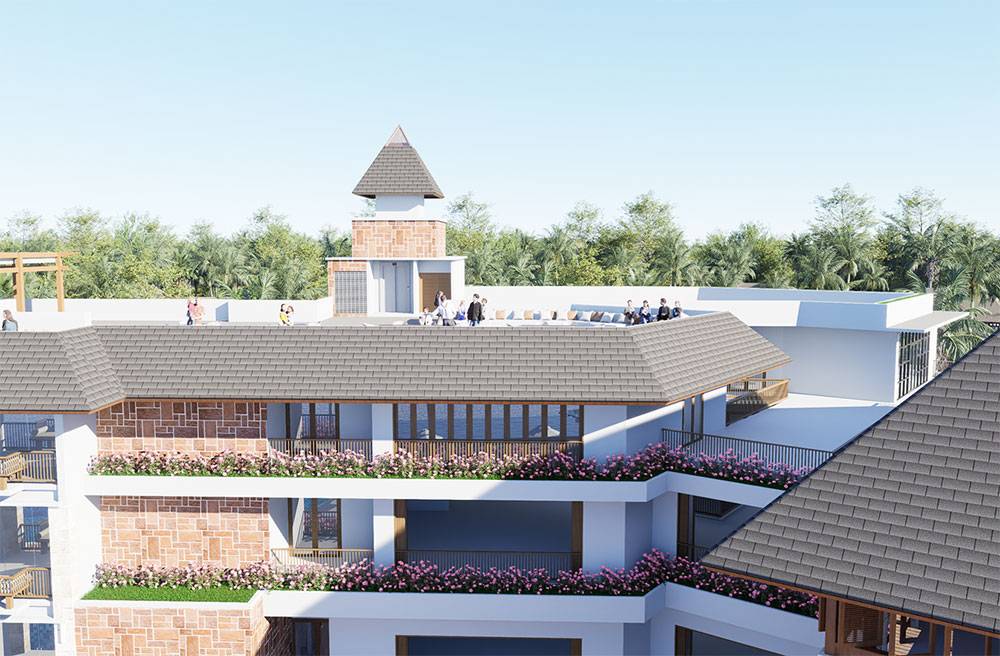 Architecturally, Naau Resort adopts a contemporary tropical language enriched by local material character. Pitched roofs, stone masonry, warm timber accents, and shaded verandas reference vernacular proportions while being interpreted through modern detailing. Building massing is carefully scaled and articulated to avoid visual dominance, ensuring the resort blends naturally with the palm-lined coastline.