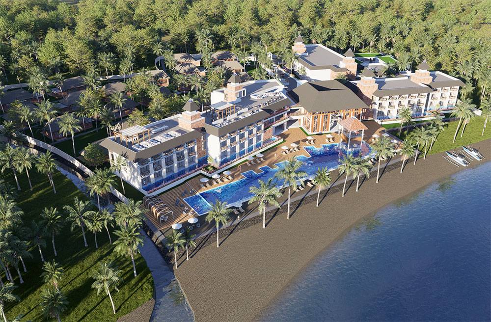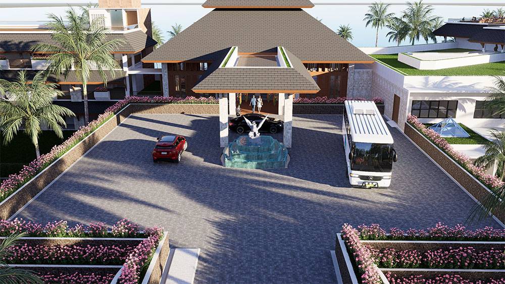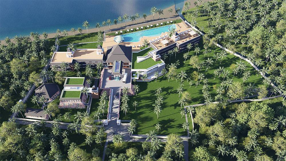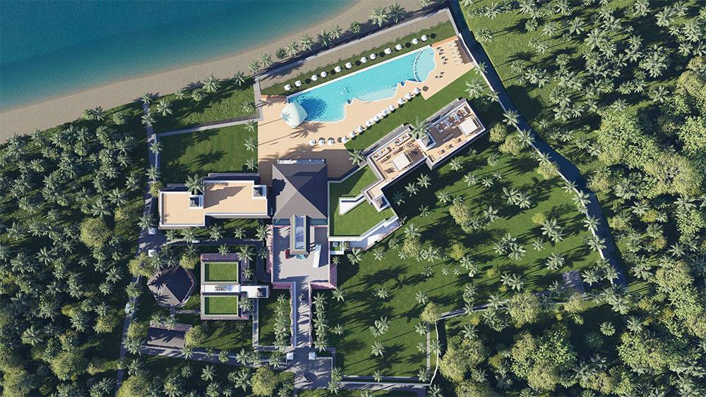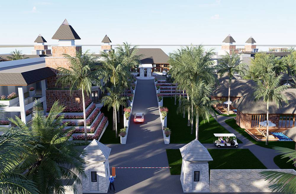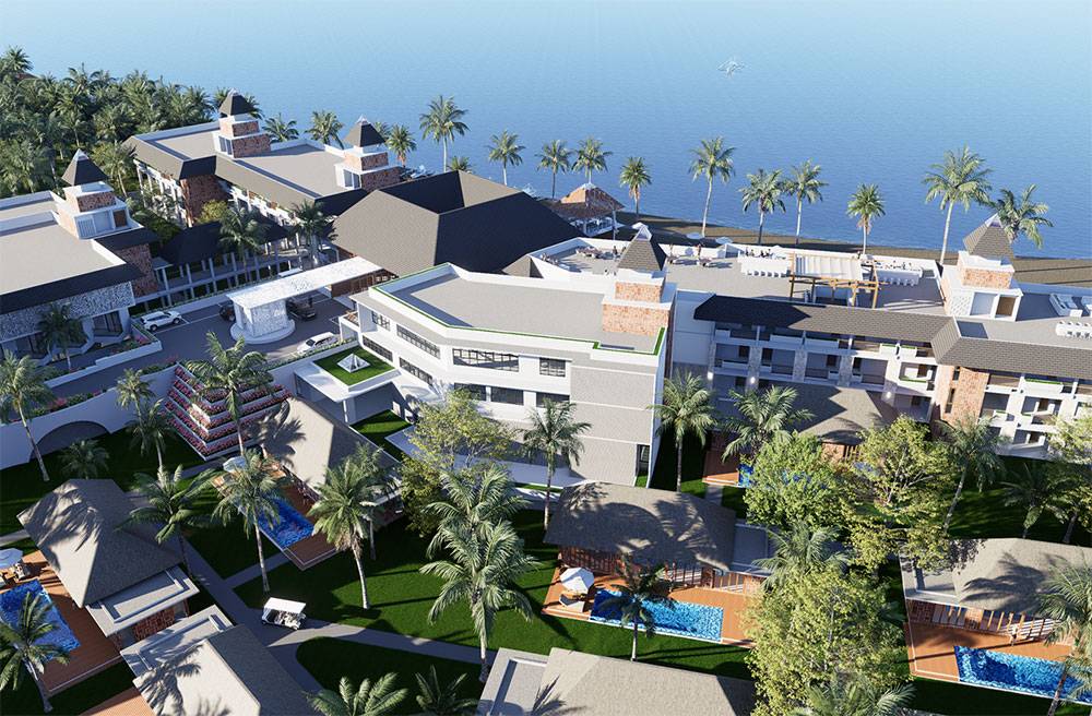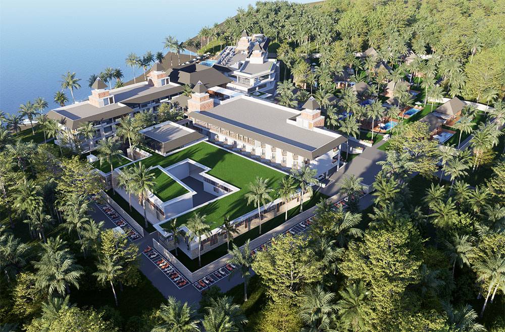 The masterplan is structured as a resort village, with hotel blocks, villa clusters, and communal facilities arranged along a clear axial arrival sequence that gently unfolds toward the sea. The beachfront zone is activated by pools, sun decks, and leisure terraces, while villas are set deeper within landscaped areas to ensure privacy and immersion in greenery. Circulation prioritizes walkability, allowing guests to experience the site at a relaxed, human pace.