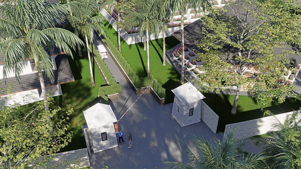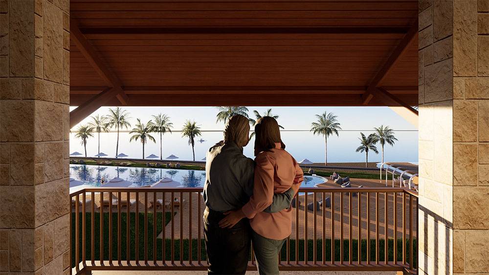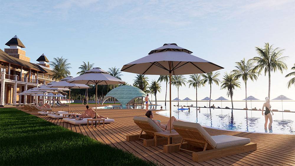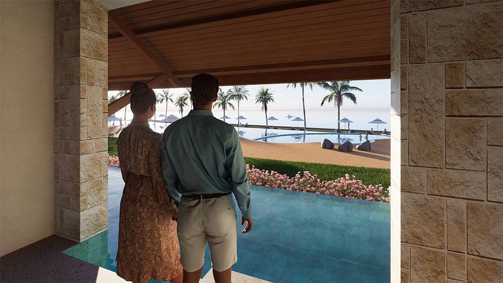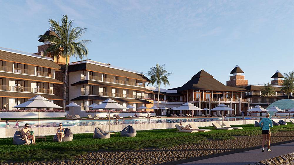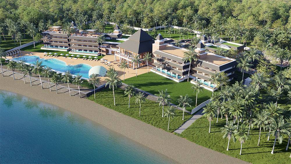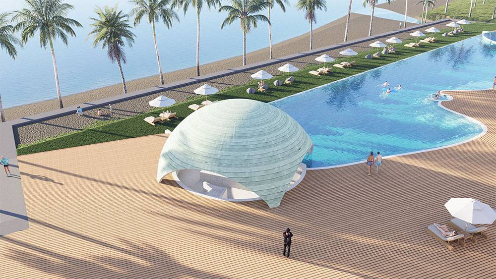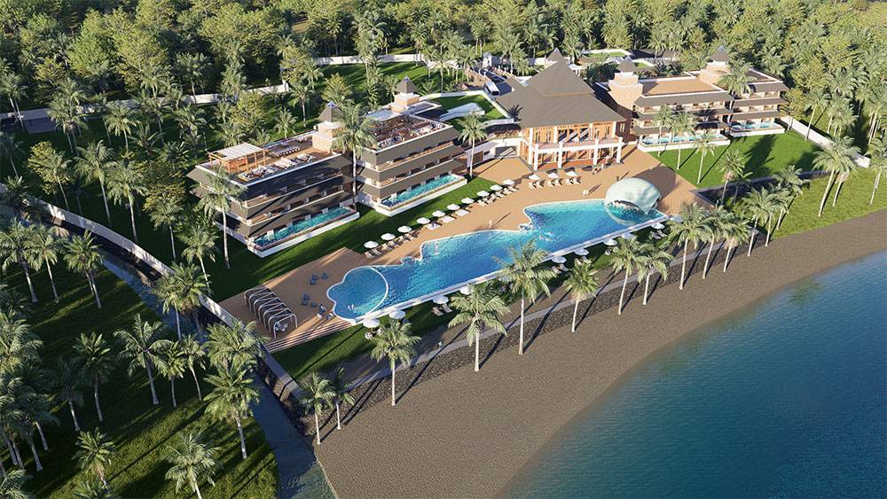 The masterplan is structured as a resort village, with hotel blocks, villa clusters, and communal facilities arranged along a clear axial arrival sequence that gently unfolds toward the sea. The beachfront zone is activated by pools, sun decks, and leisure terraces, while villas are set deeper within landscaped areas to ensure privacy and immersion in greenery. Circulation prioritizes walkability, allowing guests to experience the site at a relaxed, human pace.