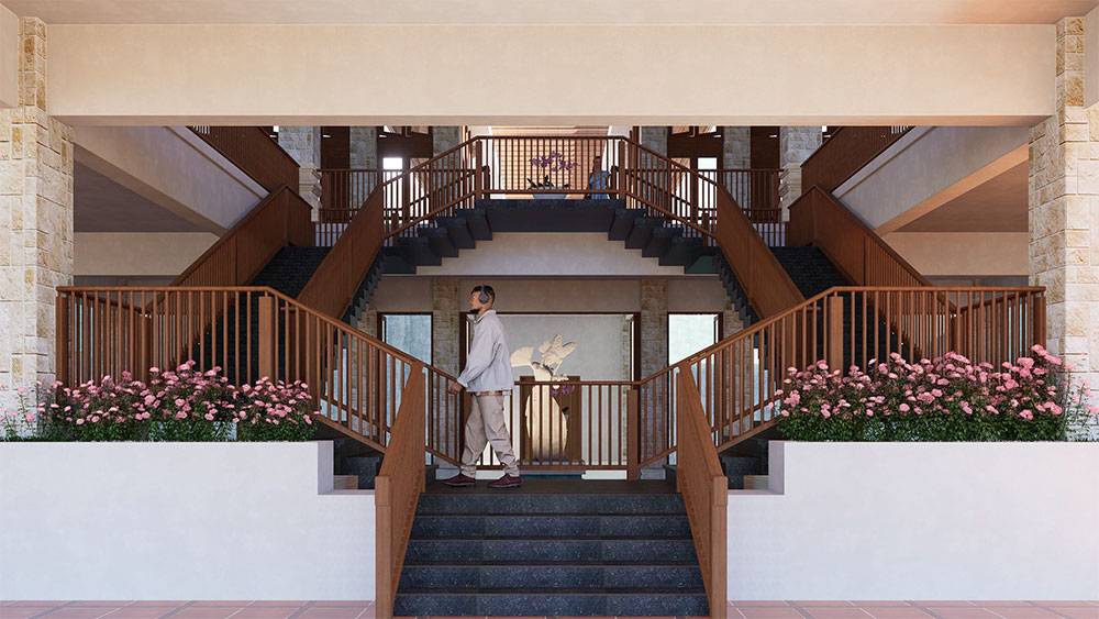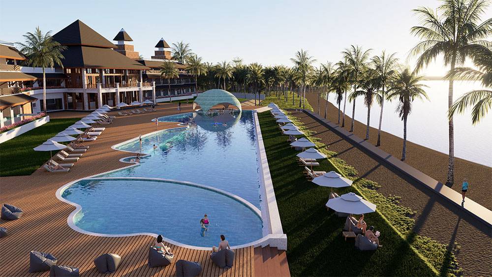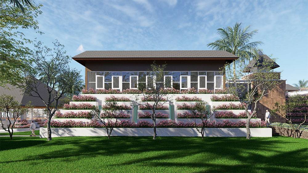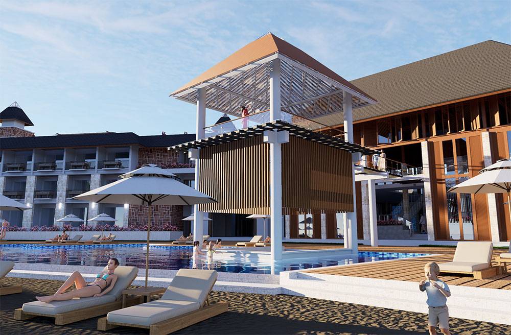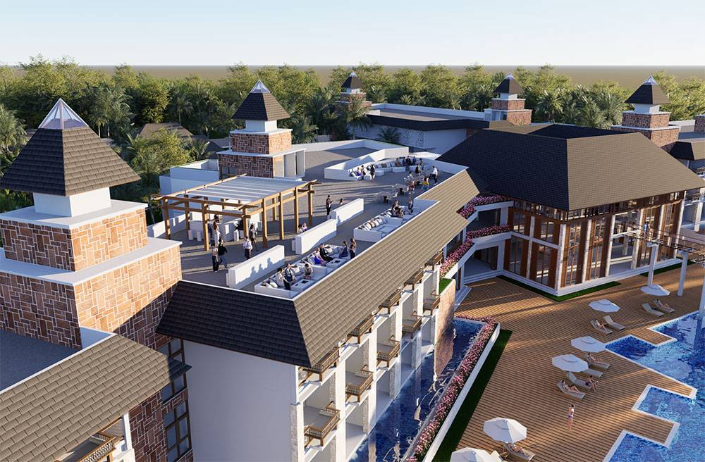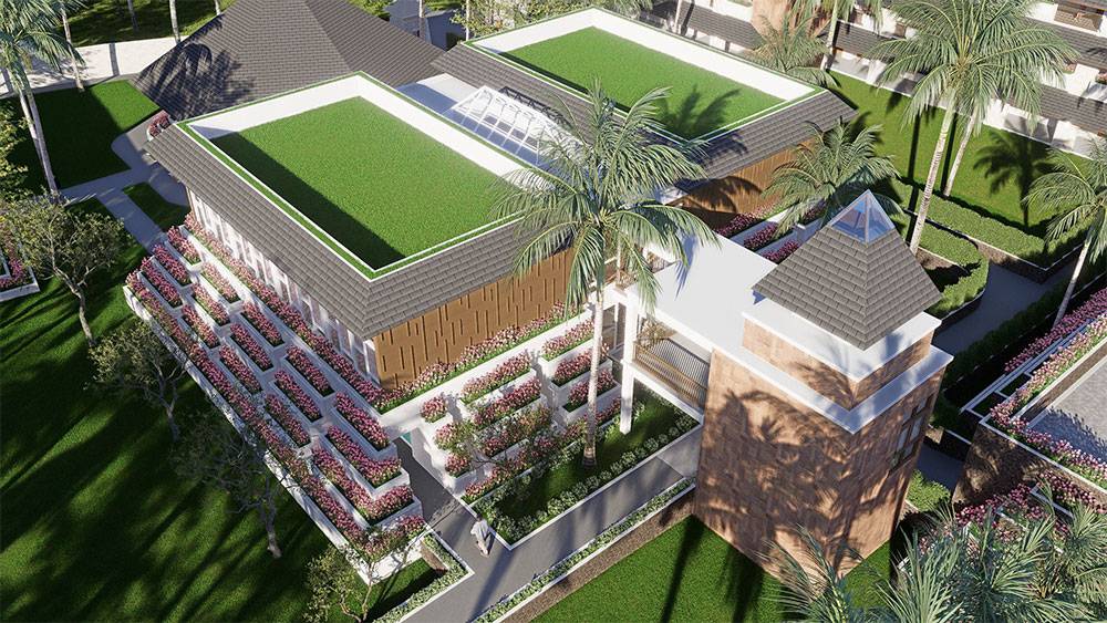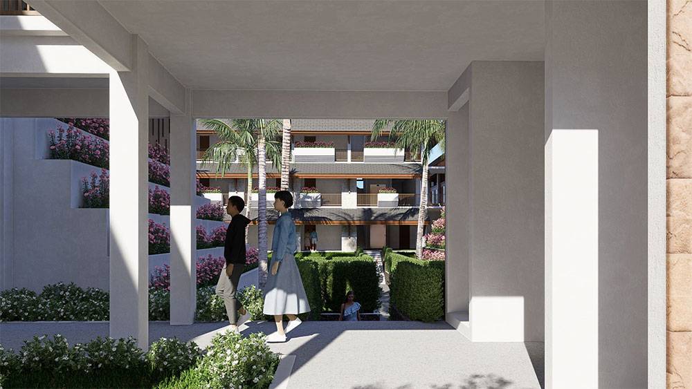 The masterplan is structured as a resort village, with hotel blocks, villa clusters, and communal facilities arranged along a clear axial arrival sequence that gently unfolds toward the sea. The beachfront zone is activated by pools, sun decks, and leisure terraces, while villas are set deeper within landscaped areas to ensure privacy and immersion in greenery. Circulation prioritizes walkability, allowing guests to experience the site at a relaxed, human pace.