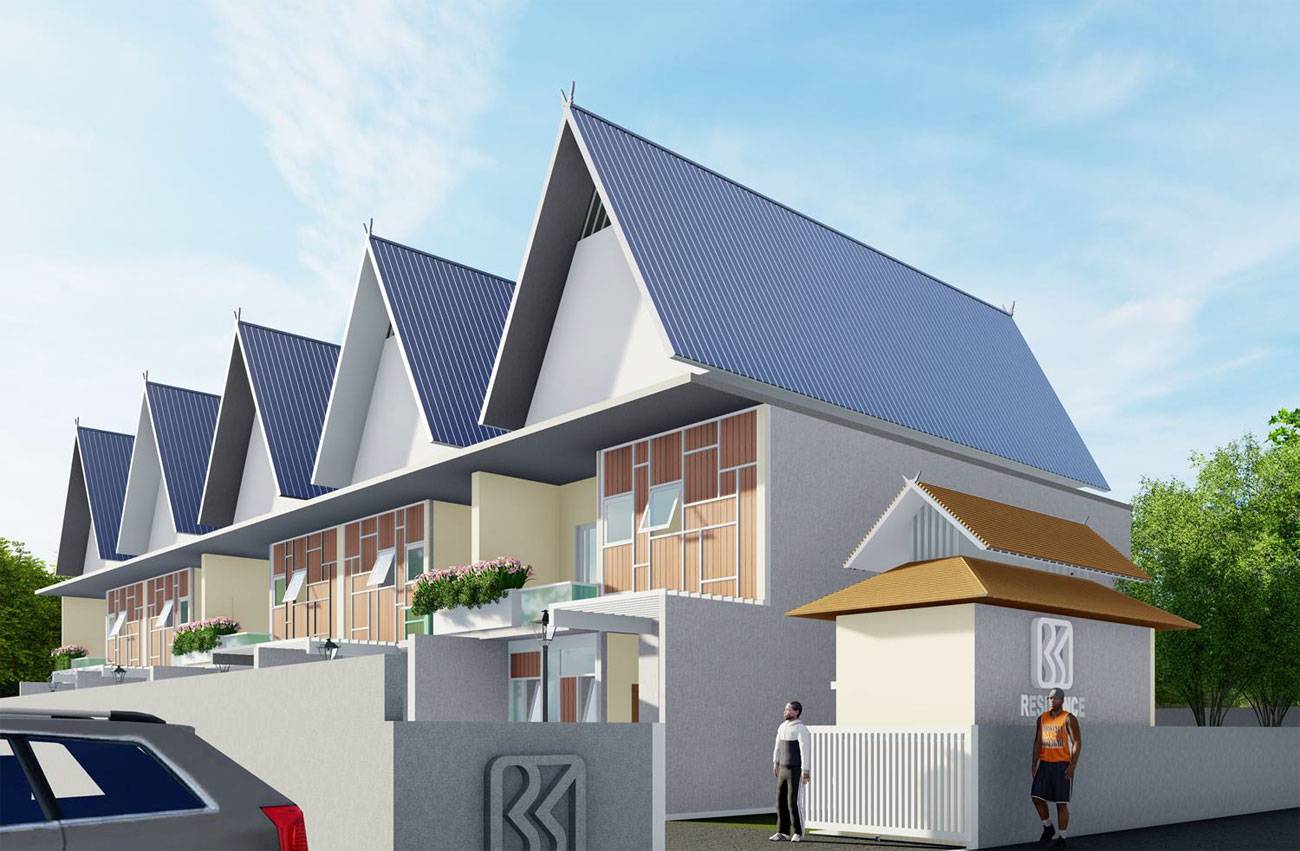 The concept emphasizes clarity, repetition, and buildability, organizing homes in a linear row-house configuration that supports efficient land use and phased construction. A strong roof rhythm—expressed through repeated steep gable forms—creates a recognizable architectural identity while responding effectively to Pekanbaru’s high rainfall and hot-humid climate.