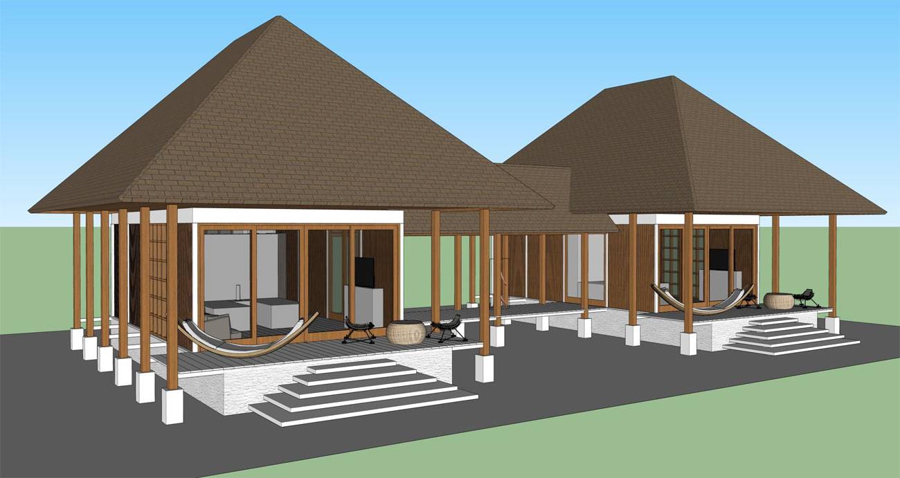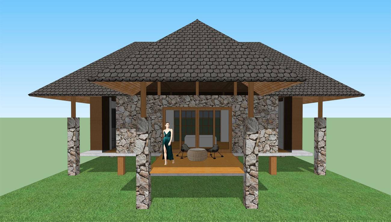 Architecturally, the resort adopts a contemporary tropical vernacular inspired by traditional Indonesian pavilions. Steeply pitched roofs, timber columns, elevated floors, and open-sided spaces are combined to promote natural ventilation, climatic comfort, and strong indoor–outdoor connections. Stone retaining walls and layered terraces anchor the buildings to the site, responding to topography while expressing permanence and craft.