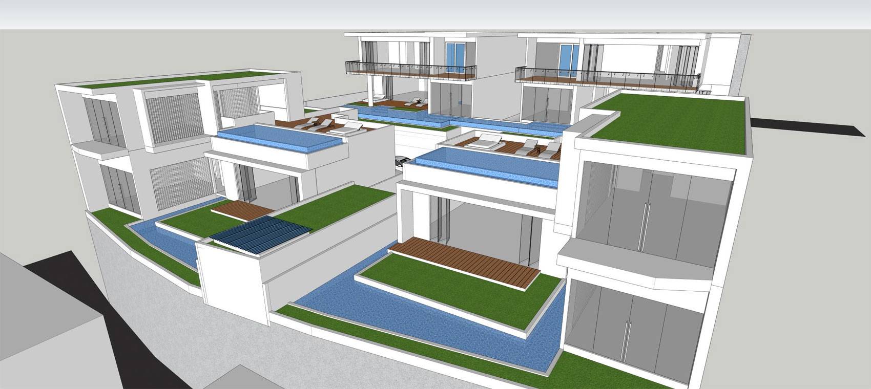 The concept organizes the villas in a layered and terraced composition, responding to site levels and maximizing views while maintaining clear separation between private, semi-private, and communal spaces. Linear water elements—such as elongated pools and water courts—become the central organizing features, guiding movement and creating a continuous visual and climatic cooling effect throughout the site.